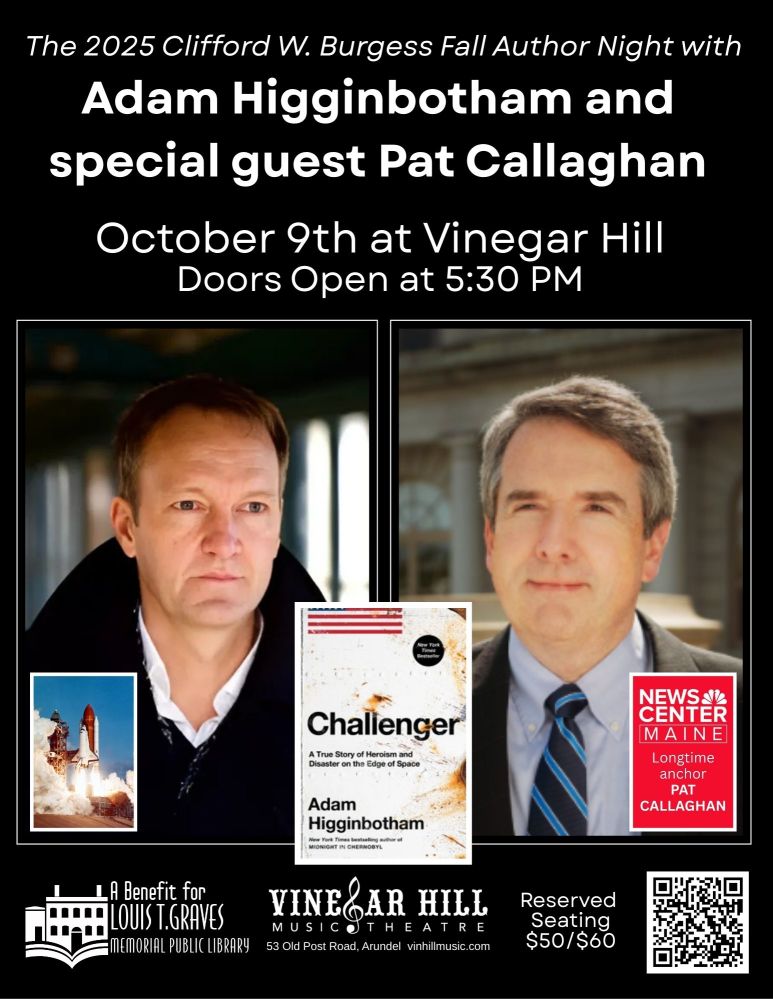 Thursday, October 9, 5:30 PM. Author Adam Higginbotham. The 2025 Clifford W. Burgess Fall Author Night, featuring Adam Higginbotham, will be held on October 9 at Vinegar Hill. The Louis T. Graves Memorial Public Library in Kennebunkport is pleased to once again partner with Vinegar Hill for this special evening with Adam Higginbotham, author of "CHALLENGER: A TRUE STORY OF HEROISM & DISASTER ON THE EDGE OF SPACE". The author will be interviewed by former TV news anchor and journalist Pat Callgahan (WCSH-TV, Portland), who covered the Challenger story in 1986. Reserved seating tickets are on sale now at vinhillmusic.com for $50-$60. Join us for food and drinks before the show in the outdoor garden prior to the event. A (cash bar) cocktail hour and book sales will start at 5:30 PM, followed by an intimate conversation with the award-winning author at 6:30 pm. From the New York Times bestselling author of "Midnight in Chernobyl" comes the definitive, dramatic, minute-by-minute story of the Challenger disaster based on fascinating new archival research and in-depth reporting—a riveting history that reads like a thriller. A masterful blend of human drama and fascinating and absorbing science, "Challenger" brings to life a turning point in history—and the result is an even more complex and astonishing story than we remember. Graves Library thanks Clifford W. Burgess, Octopus Books, Lark Hotels and Vinegar Hill Music Theatre for their continued generosity in sponsoring this event. Vinegar Hill Music Theatre is located at: 53 Old Post Road, Arundel, Maine 04046, Tel: 207-985-5552.The proceeds of all tickets sold benefit the Louis T. Graves Memorial Public Library.