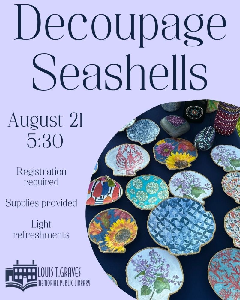https://graveslibrary.org/event/decoupage-seashells-august-21-530-pm/Event Dates