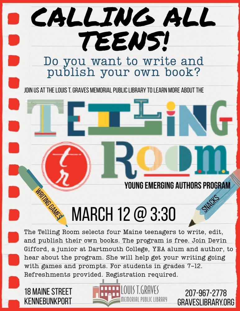 Thursday, March 12, 3:30-4:30 PM. The Telling Room. Do you want to write and publish your own book? The Telling Room's Young Emerging Authors program is a free, paid, 15 month-long writing and publishing program. Every spring, we select four Maine teenagers in grades 8 -12 to write, edit, and publish their own books. Join Devin Gifford, a junior at Dartmouth College, YEA alum and author of "The Unraveling" to hear about the program. She will discuss the process of writing a book, as well as help get your own writing going with games and prompts. This program is for students in grades 7-12, and pre-registration is encouraged. Light refreshments will be provided. The Louis T. Graves Memorial Public Library is located at 18 Maine Street, Kennebunkport. For further information, please call 207-967-2778 and ask for the Junior Room or visit www.graveslibrary.org.